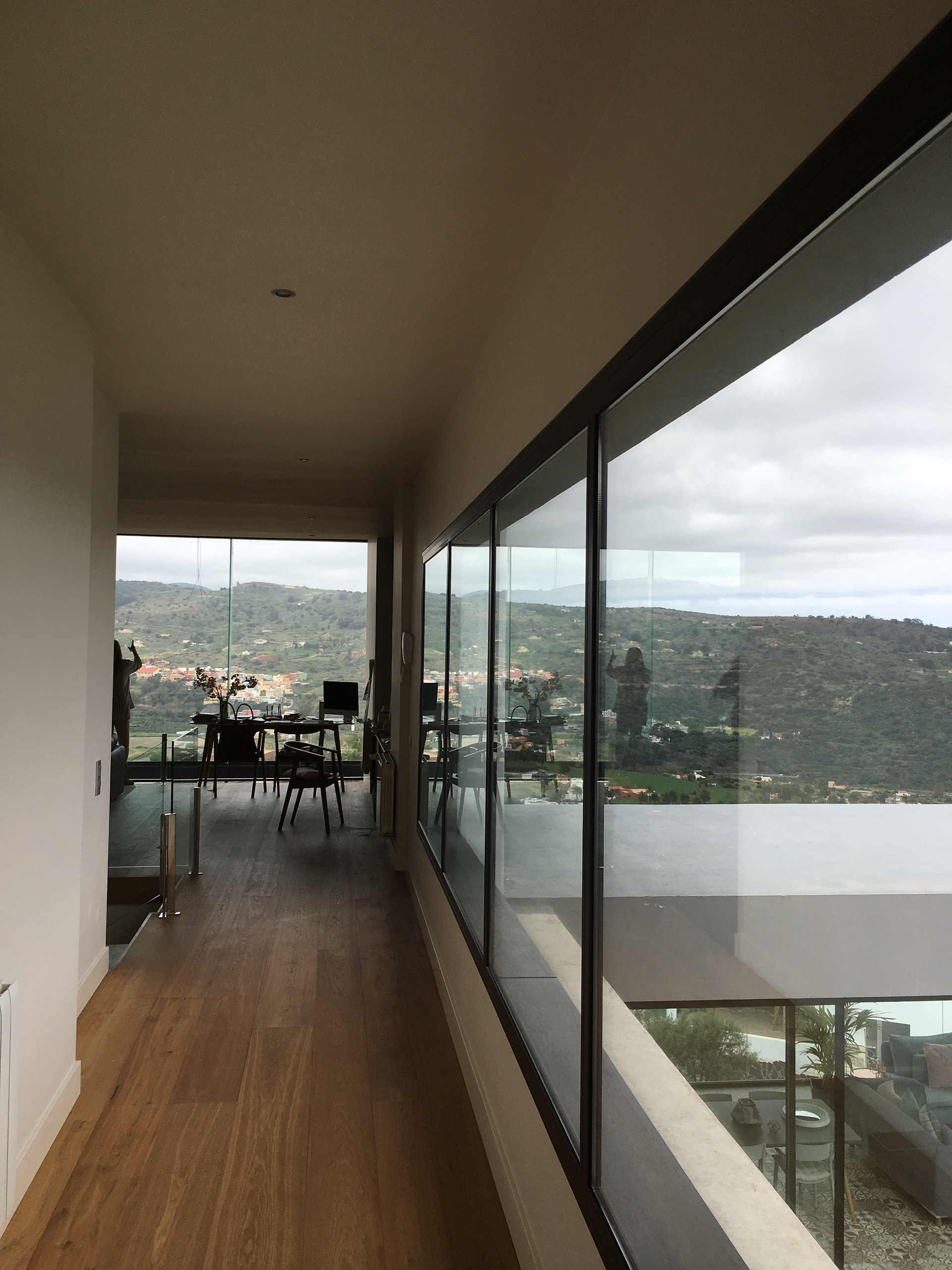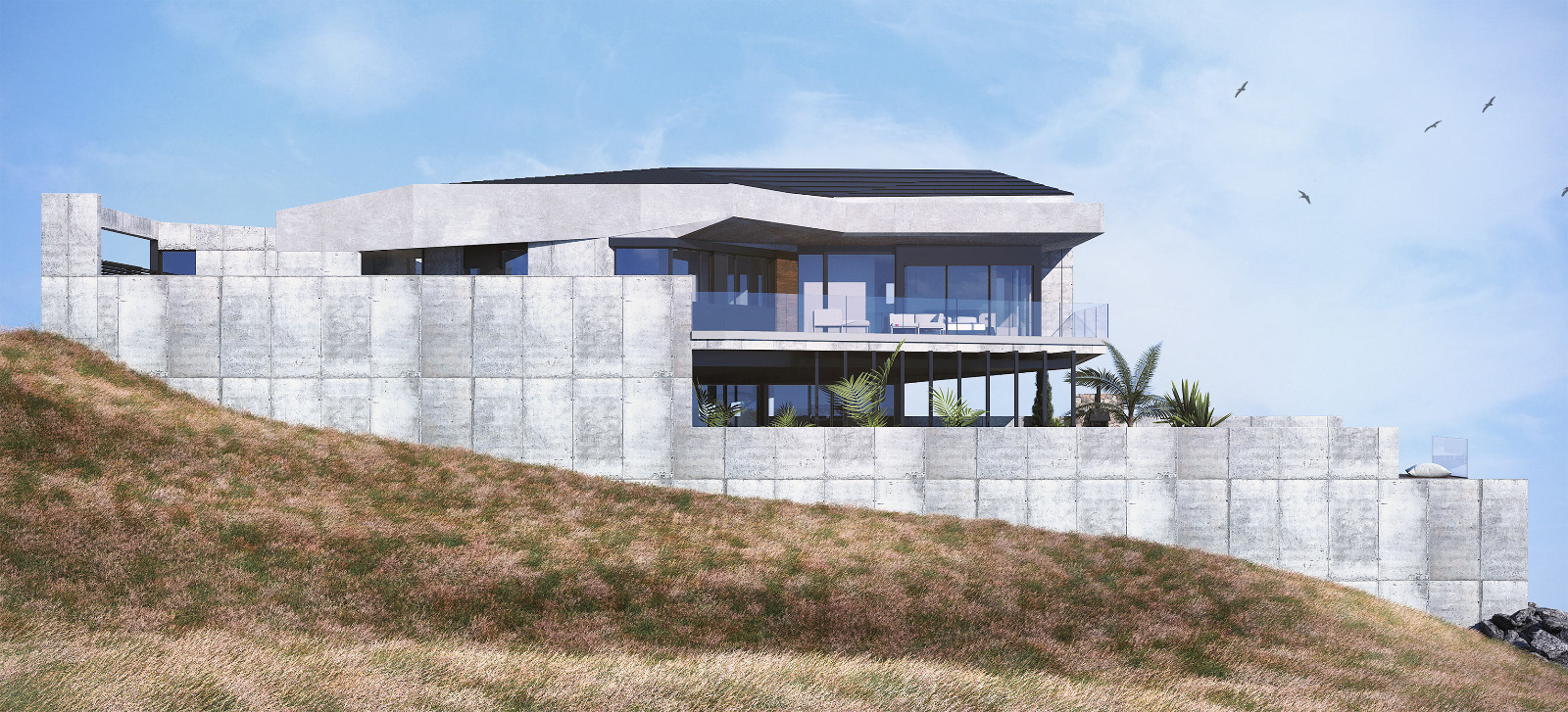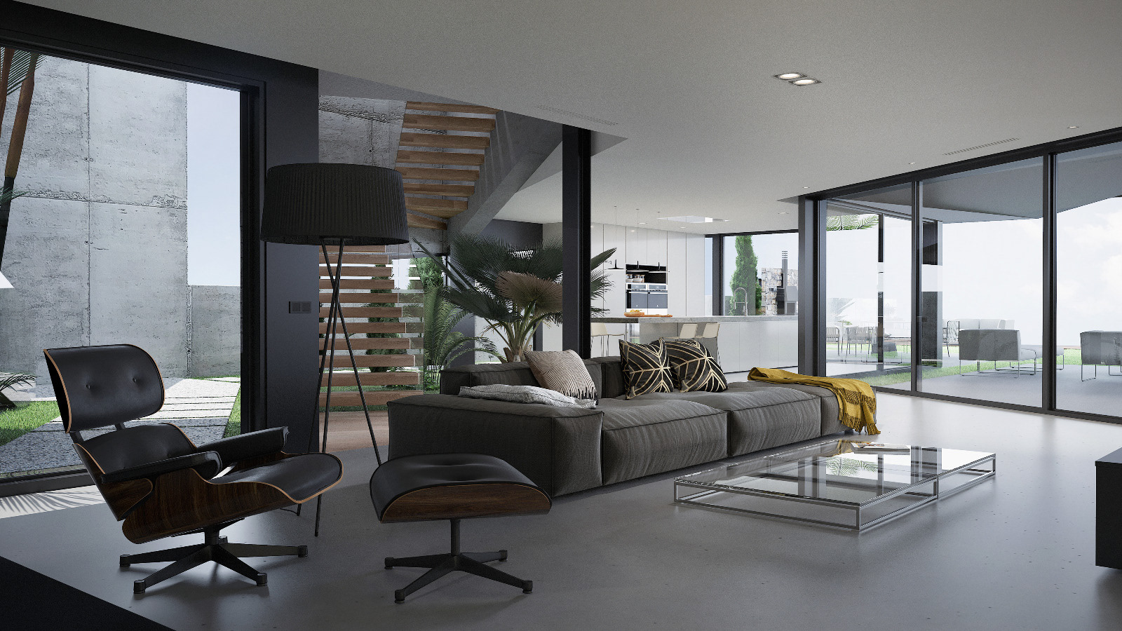 Una pieza tallada de hormigón armado visto, flotando sobre el campo de golf, el jardín se introduce en el interior de la vivienda.