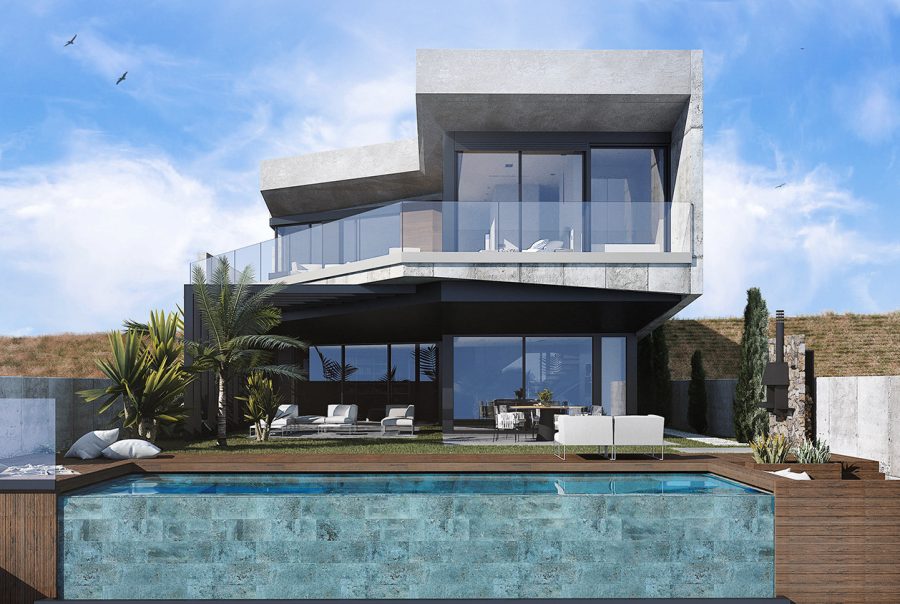 VIVIENDA UNIFAMILIAR AISLADA EN EL CORTIJO – TELDE Una pieza tallada de hormigón armado visto, flotando sobre el campo de golf, el jardín se introduce en el interior de la vivienda.